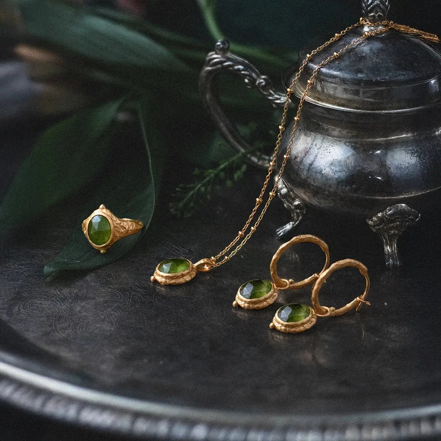 Its design features delicate details, reminiscent of rivers and vines, guiding you through transition with quiet strength. Like the pomegranate Persephone carried back from the underworld, the Vesuvianite, too, is a seed of remembrance: that every descent holds its ascent.