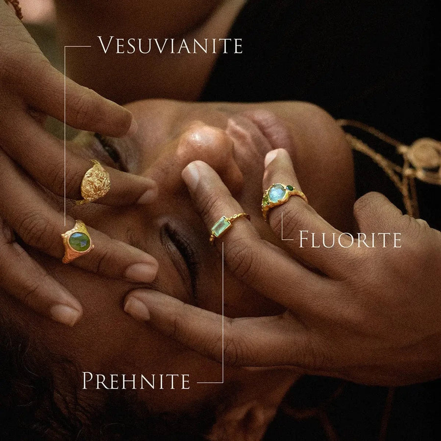 Our Resting Heart design cradles a soft green Prehnite – the “healer’s stone.” Prehnite embodies restoration, the tender phase after endings, after birth, after harvest. Just as fields must lie fallow to renew their strength, so too must we.