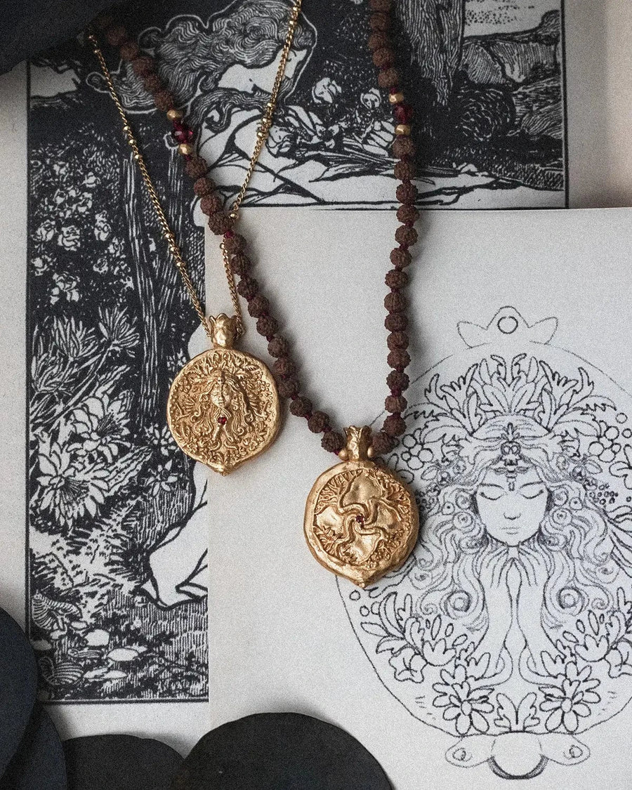 The Mother of Seasons pieces honor Demeter’s eternal embrace – she who turns the wheel of life, weaving winter into spring, summer into fall. Its flowing lines echo rivers and wheat, symbols of her fields. Circular motifs recall the womb: the place of holding, of seeding, of continuity.