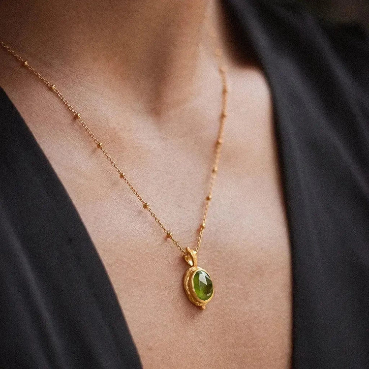 Our Companion of Passage Necklace holds an oval Vesuvianite. Green as forest lakes, this stone is known for dissolving fear and opening space for courage, making it a devoted companion at life’s thresholds. A talisman of emergence and renewal, it aligns will with the truth of the heart, guiding you through passages into new chapters.