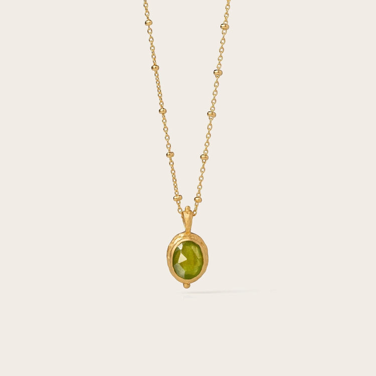 Our Companion of Passage Necklace holds an oval Vesuvianite. Green as forest lakes, this stone is known for dissolving fear and opening space for courage, making it a devoted companion at life’s thresholds. A talisman of emergence and renewal, it aligns will with the truth of the heart, guiding you through passages into new chapters.