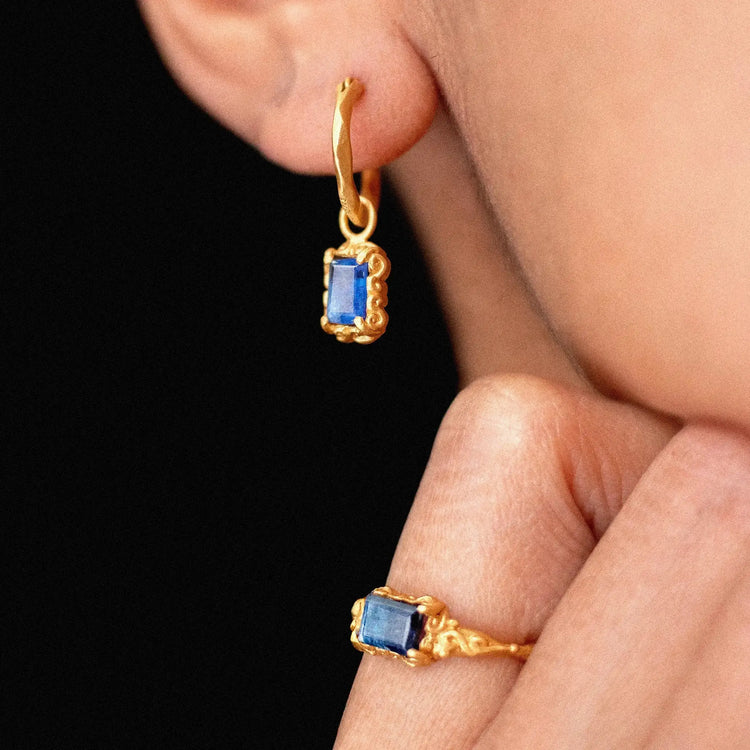 These graceful, organically embellished hoop earrings invoke the quiet, steady power of the beautifully cut Kyanite stone within. They offer presence rather than emphasis, inviting coherence amidst changes.