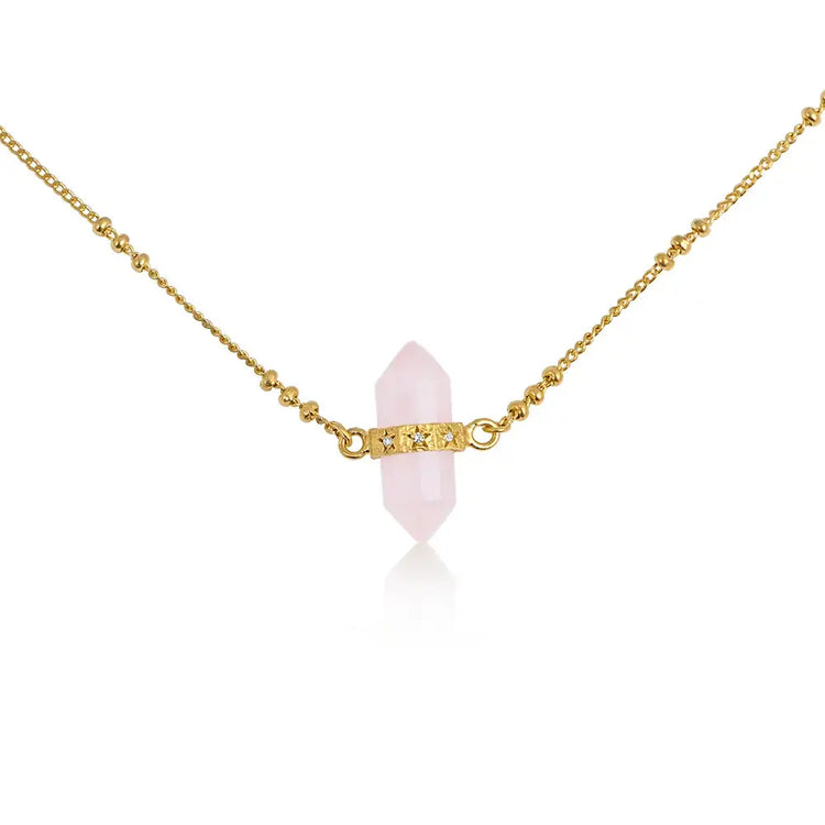 This pointed Rose Quartz is here to remind you to always show up in your best ways with all that you are and have. The heart-bursting Rose Quartz is hugged by 6 star-shaped White Topaz stones. Widely known as the “love” or “heart” stone, Rose Quartz encourages unconditional love.
