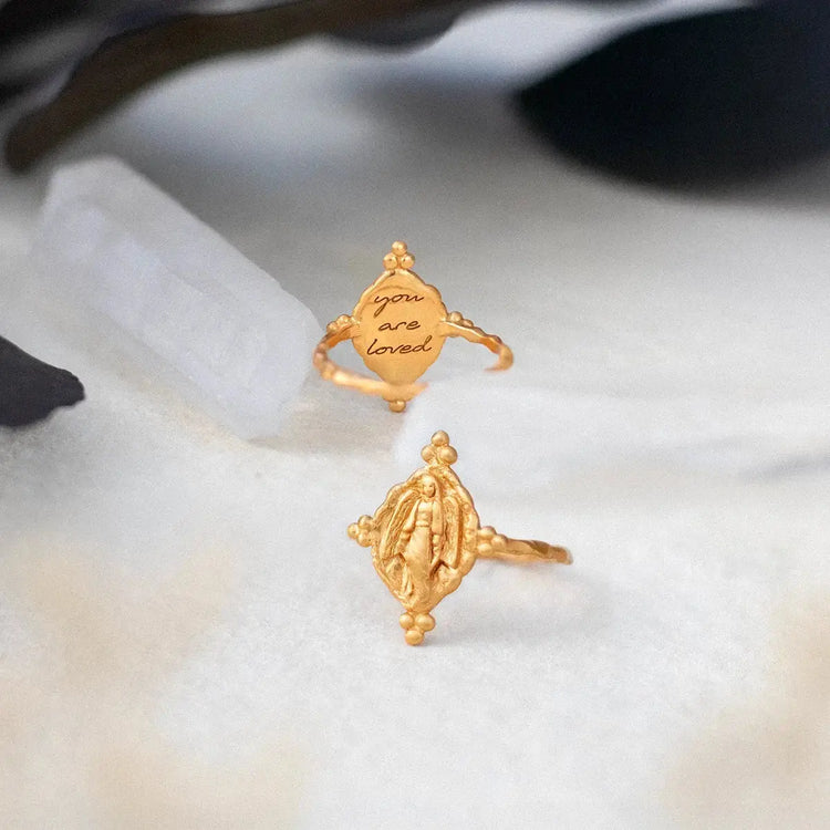 A quiet tribute to the nurturing love of the divine mother, this ring features an angelic depiction of Mother Mary and You are loved engraved on the inside: whispers of comfort to carry with you, reminding you that you are never alone, always held, and safe to surrender into your angels’ embrace.